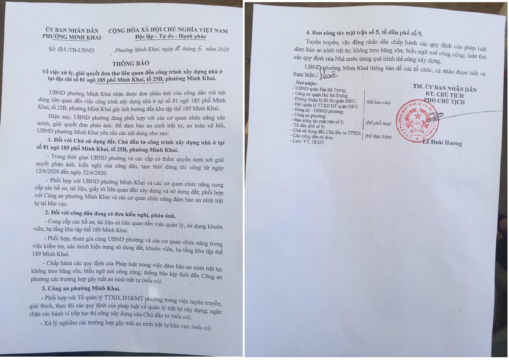 Ngày 12/6/2020, UBND phường Minh Khai đã có văn bản số 134/TB-UBND, yêu cầu chủ đầu tư công trình xây dựng trên tạm dừng thi công từ ngày 12/6/2020 đến ngày 22/6/2020. Về nội dung này, UBND phường Minh Khai cũng đã báo cáo đến UBND quận Hai Bà Trưng và các phòng chuyên môn của quận.