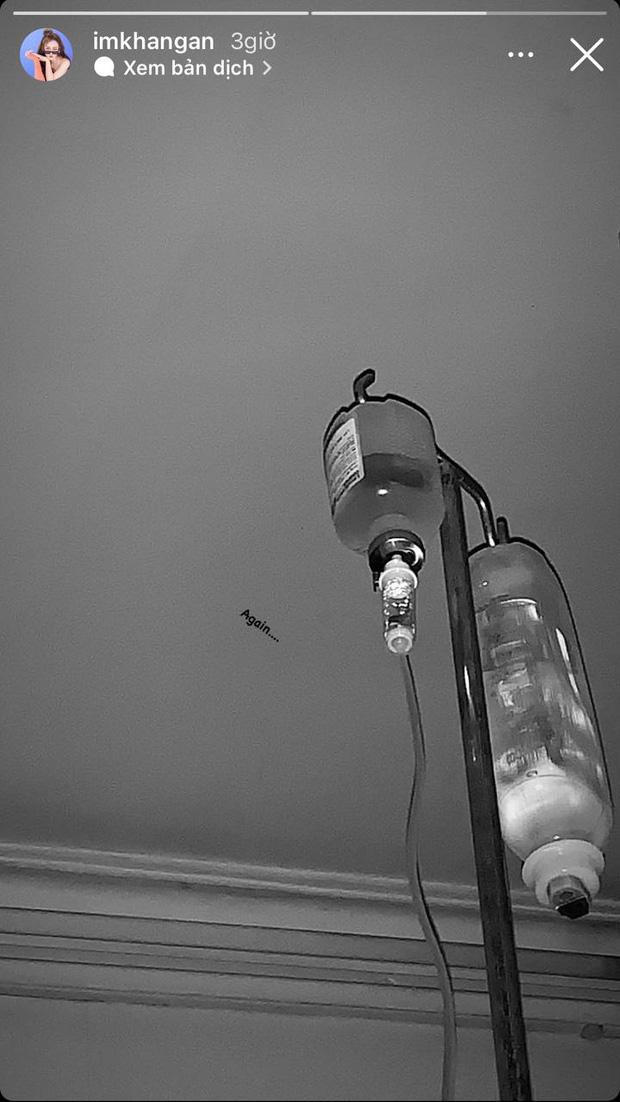 Cách đây ít hôm, Khả Ngân thông báo với khán giả đã được ra viện sau hơn 10 ngày liền sốt cao và ho ra máu. Mừng rỡ chưa được lâu, chiều 3/8, Khả Ngân bất ngờ đăng ảnh hé lộ việc phải quay trở lại bệnh viện. "Again..." (Lại...), Khả Ngân viết trên trang cá nhân.