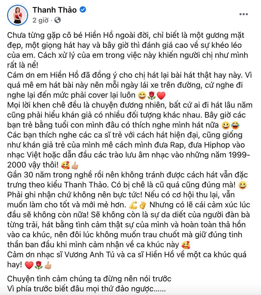 Trên trang cá nhân, ca sĩ Thanh Thảo mới có bài viết dài sau những ồn ào bị chê bai giọng hát trong bản cover ca khúc Gặp Nhưng Không Ở Lại của Hiền Hồ. Theo đó, nữ ca sĩ chia sẻ bài phỏng vấn đàn em dành lời khen cho cô khi hát lại bản hit này, đồng thời cho biết bản thân đánh giá cao sự khéo léo của Hiền Hồ.