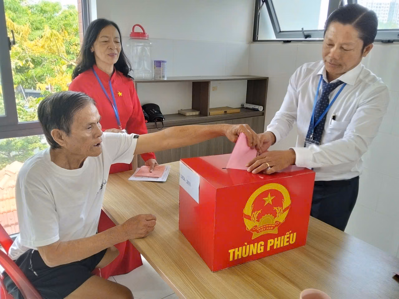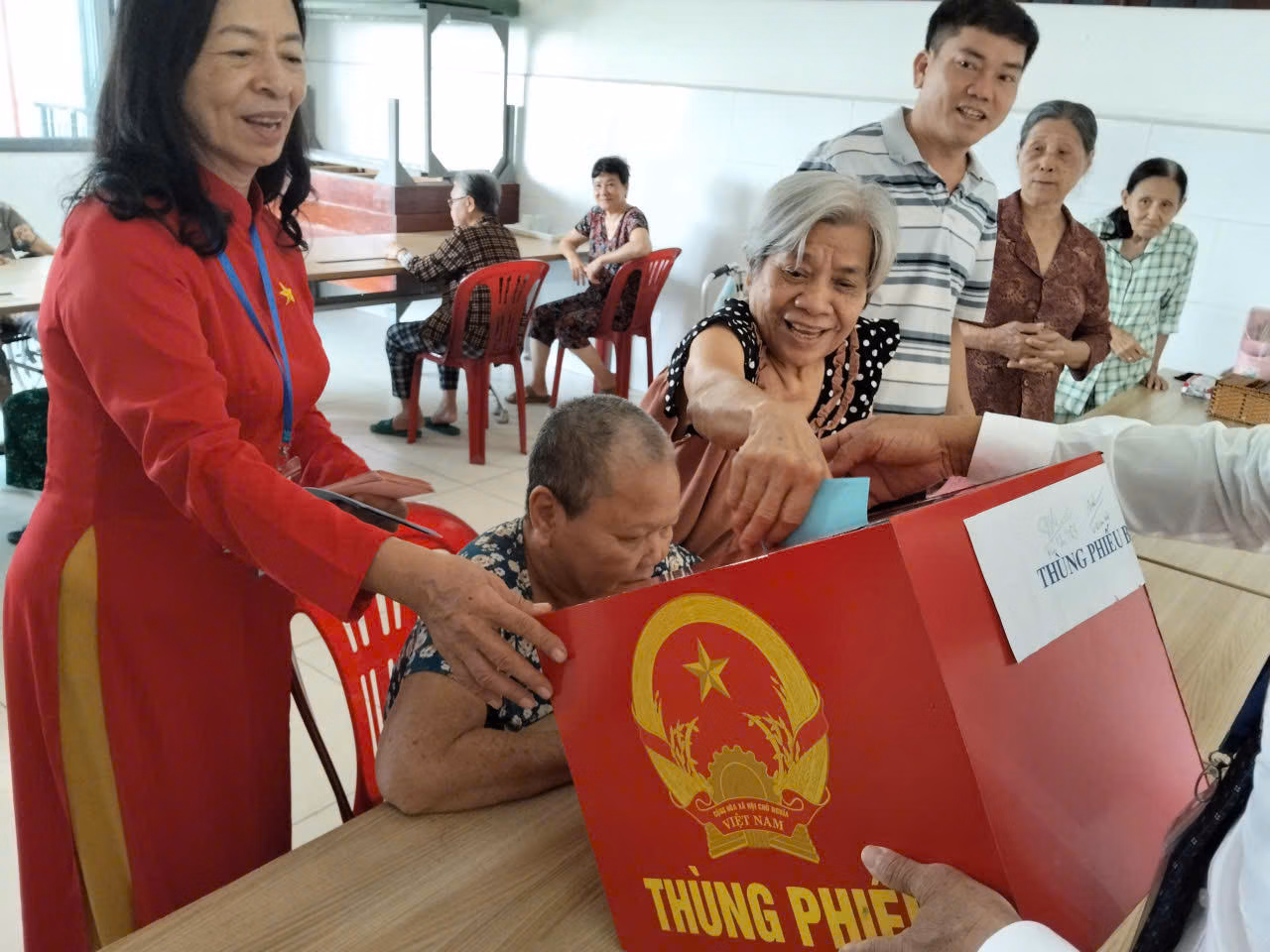 Buổi trưa, khi vắng cử tri đến bỏ phiếu, bà Lê Thị Quý Mĩnh - Tổ trưởng Tổ bầu cử số 2, phường Thới An cùng tổ bầu cử mang thùng phiếu phụ đến nhà Dưỡng lão Vị Hoàng để giúp người già, người khuyết tật tại đây được bỏ phiếu.