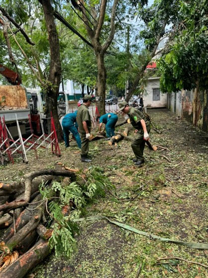 Lực lượng chức năng của phường gồm Đoàn Thanh niên, dân quân, lực lượng bảo vệ an ninh ở cơ sở, nhân công đơn vị thi công các dự án trên địa bàn, cán bộ đô thị phường, Công an phường… cùng 1 máy cẩu, 3 ô tô tải, 5 máy cưa… tiếp tục được huy động tổng vệ sinh, dọn dẹp cành cây, gốc cây, lá cây... bị gãy đổ, rơi dọc các tuyến phố, ngõ ngách.