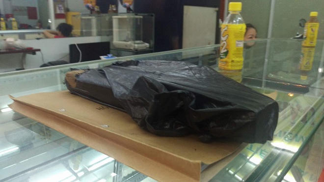 Đang đứng phía trong quầy, chủ tiệm quan sát thấy tên cướp không có vũ khí nguy hiểm mà chỉ cầm khúc cây, vừa định lao qua tủ ngăn chặn thì bị Huy ném khúc cây vào người nên phải dừng lại tránh né. Không lấy được vàng, Huy bỏ chạy về hướng vòng xoay Tam Hiệp.