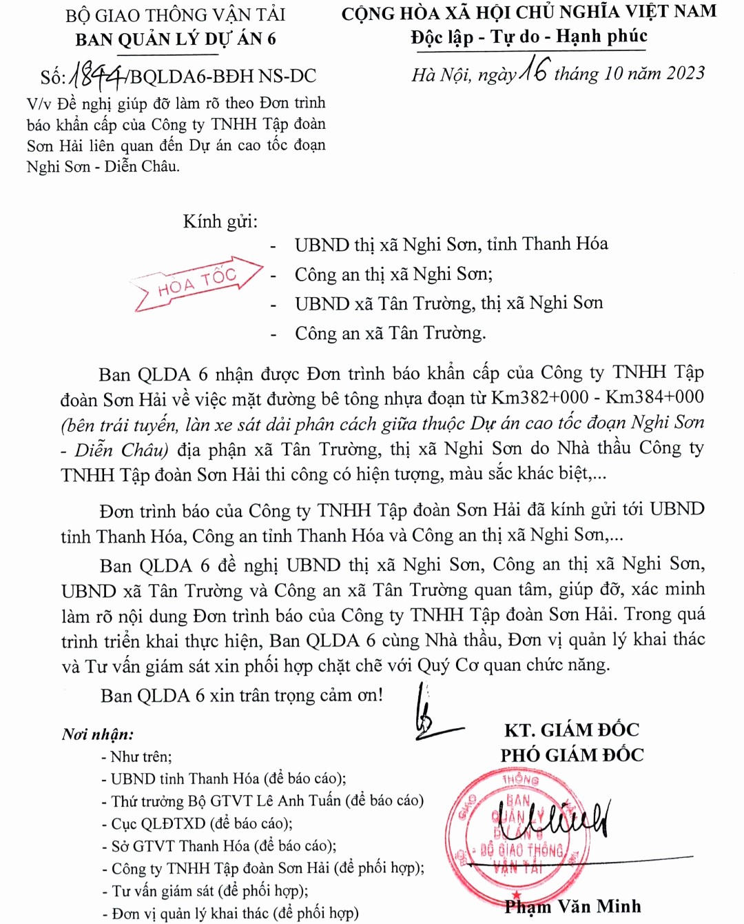Liên quan tới lá Đơn trình báo khẩn cấp cách đây 2 ngày của Sơn Hải về việc mặt đường bê tông nhựa đoạn qua Km382 - Km384 thuộc cao tốc Nghi Sơn - Diễn Châu bị nghi đổ hóa chất phá hoại, Giám đốc PMU6 cho hay, ngày 16/10, PMU6 đã báo cáo Bộ trưởng GTVT Nguyễn Văn Thắng.