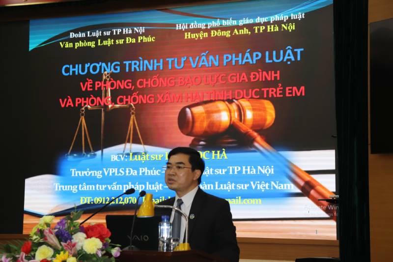 Ngay sau lễ ra mắt, Hội LHPN huyện Đông Anh phối hợp Phòng Tư pháp huyện, Văn phòng Luật sư Đa Phúc (Đoàn Luật sư TP Hà Nội ) tổ chức chương trình tư vấn pháp luật về phòng, chống bạo lực gia đình và phòng chống xâm hại tình dục trẻ em. Tại chương trình, Luật sư Lê Ngọc Hà - Trưởng Văn phòng Luật sư Đa Phúc đã tư vấn pháp luật liên quan cho khoảng 70 hội viên Hội LHPN huyện tại điểm cầu chính là hội trường Huyện ủy, UBND huyện Đông Anh và kết nối trực tuyến tới 24 điểm cầu đặt tại các xã, thị trấn trên địa bàn huyện Đông Anh.