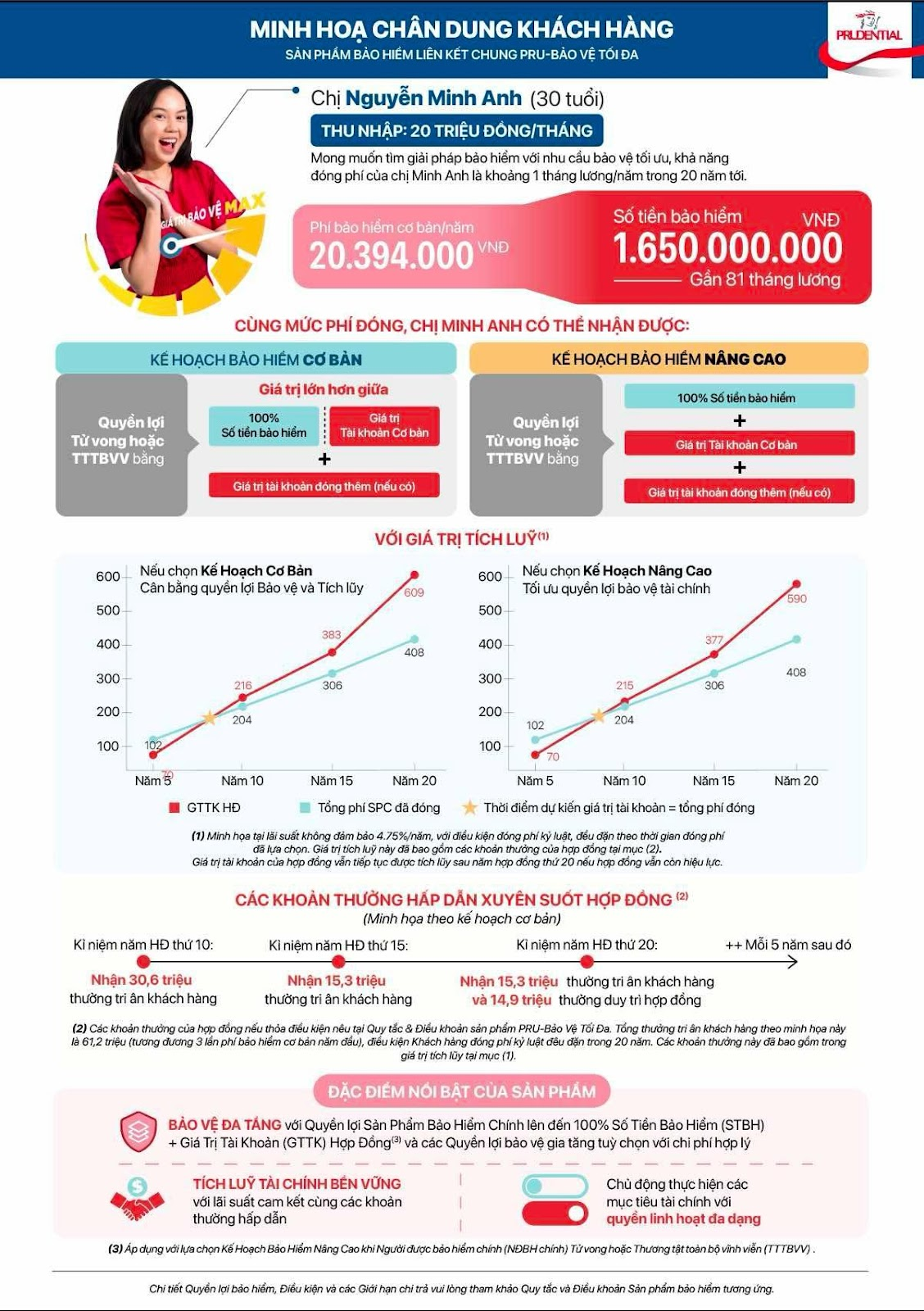 Sản phẩm này còn được thiết kế nhằm tích lũy tài chính bền vững với lãi suất cam kết cùng các khoản thưởng hấp dẫn như thưởng tri ân khách hàng vào ngày kỉ niệm năm Hợp đồng thứ 10 đầu tiên và mỗi 5 năm sau đó. Ngoài ra, khách hàng còn nhận được khoản thưởng duy trì hợp đồng vào từ Năm hợp đồng thứ 20 khi đáp ứng các điều kiện theo Quy tắc điều khoản sản phẩm.