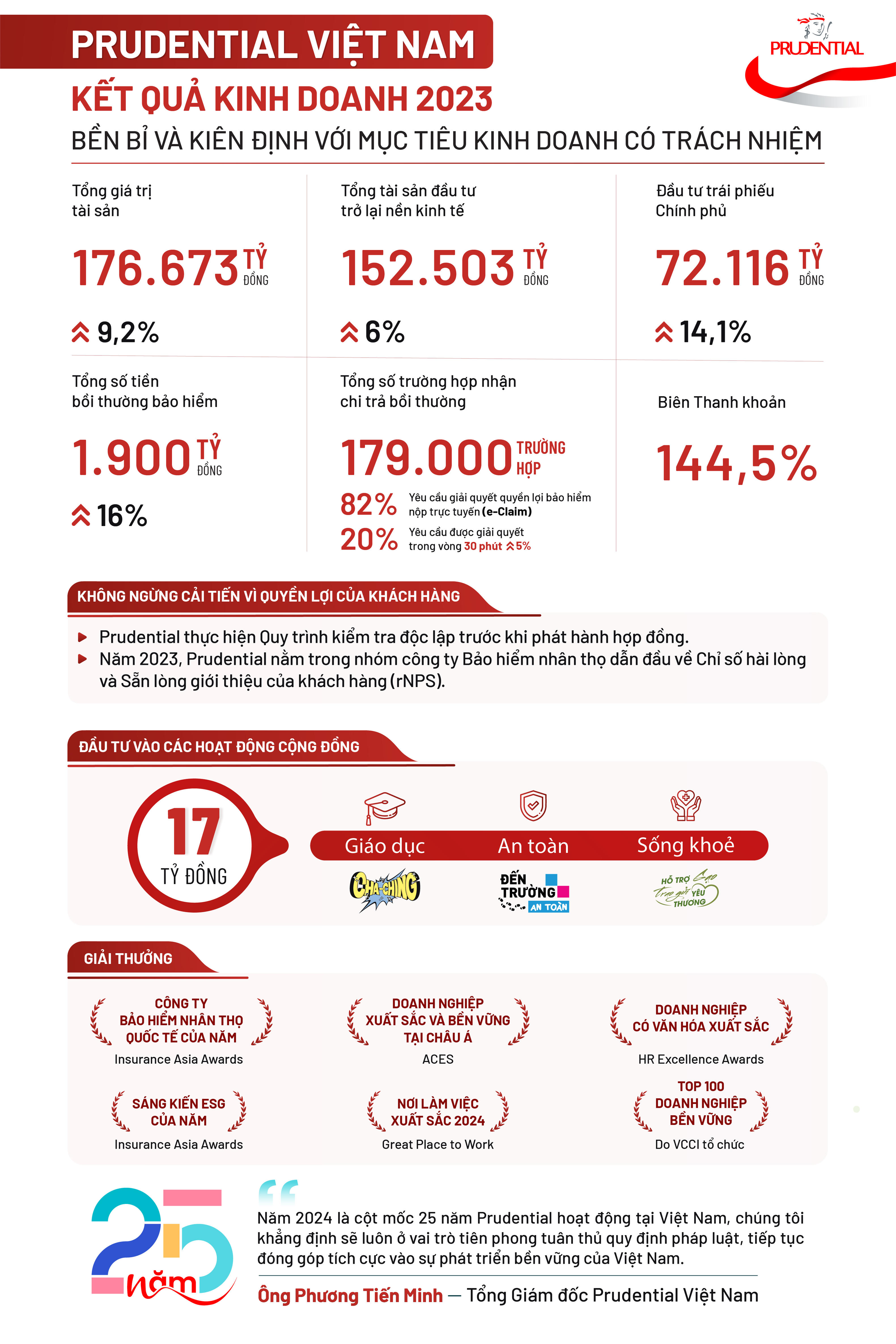 Prudential cũng duy trì được biên thanh khoản luôn ở mức cao hơn yêu cầu, đảm bảo khả năng chi trả cho khách hàng với 144,5%. Tổng bồi thường bảo hiểm đạt 1.900 tỷ đồng, tăng 16%. Tổng số ca chi trả bồi thường bảo hiểm trong năm 2023 là 179.000 trường hợp. Tính đến cuối năm, có hơn 82% yêu cầu giải quyết quyền lợi từ khách hàng được nộp trực tuyến, trong đó gần 20% yêu cầu được xử lý trong vòng 30 phút (tăng 5% so với năm 2022).