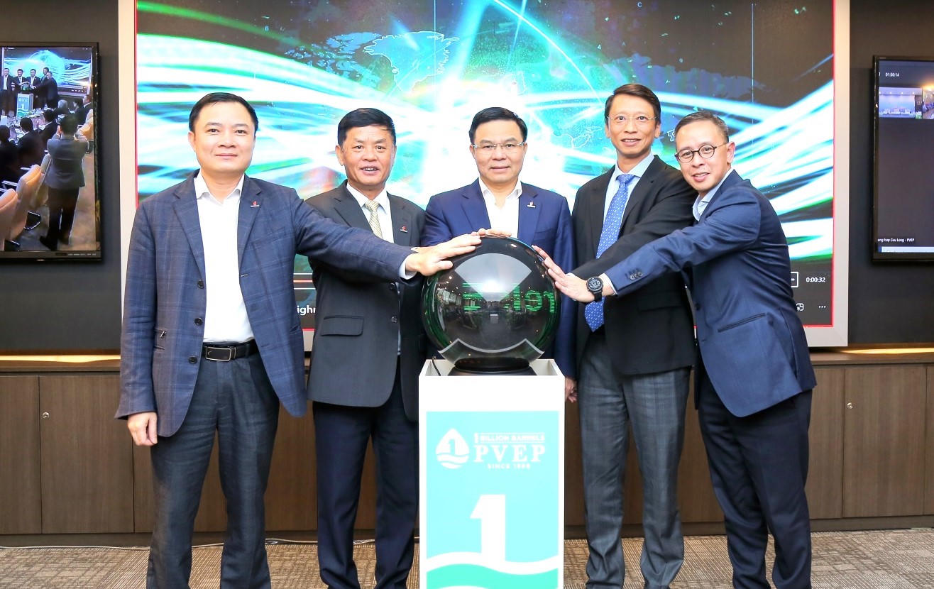 Tổng Giám đốc PVN Lê Mạnh Hùng (giữa) và lãnh đạo PVEP mừng công khai thác 1 tỷ thùng dầu của PVEP hôm 22/2/2023. |