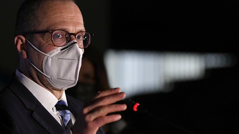 Giám đốc Tổ chức Y tế Thế giới về Châu Âu Hans Kluge phát biểu trước truyền thông trong cuộc họp báo tại một trung tâm tiêm chủng ở Bucharest, Romania, Thứ Tư, ngày 7 tháng 4 năm 2021. |