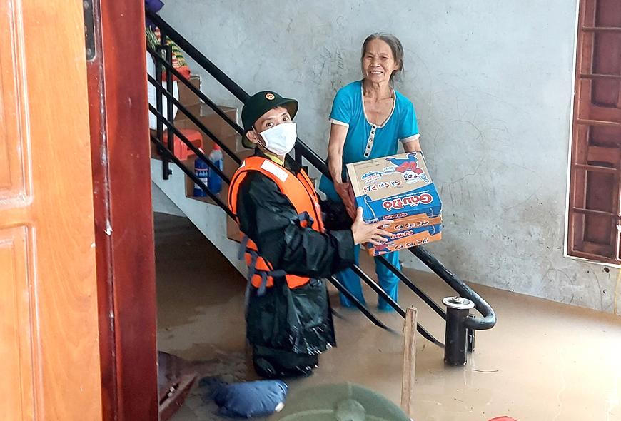 Sáng qua (24/10), Bộ Chỉ huy quân sự (CHQS) tỉnh Quảng Ngãi đã chỉ đạo Ban CHQS huyện Bình Sơn tổ chức hơn 50 cán bộ, chiến sĩ thường trực, lực lượng dân quân cùng các phương tiện ca nô, xuồng máy luồn lách vào các ngõ hẻm, tiếp cận các hộ gia đình có người đang mắc kẹt trong lũ để cứu gần 100 người dân tại thôn Long Vĩnh (xã Bình Long, huyện Bình Sơn) bị cô lập hoàn toàn đến vị trí an toàn. Ban CHQS huyện Bình Sơn đã hỗ trợ 30 thùng mì ăn liền, nước uống cho những hộ dân bị cô lập.