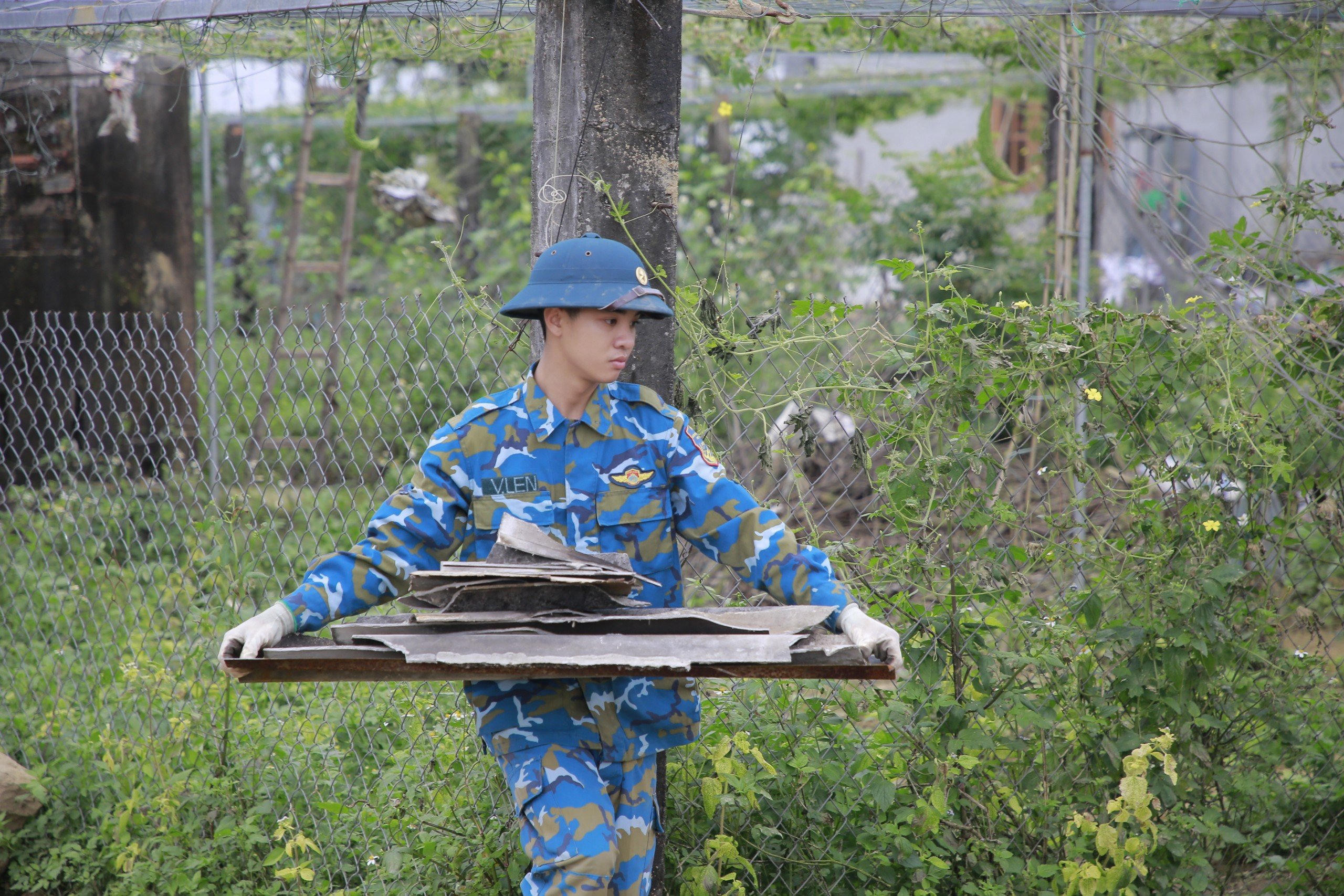 Các chiến sĩ dọn dẹp mảnh tôn, ngói bị hư hỏng để thay mới. |