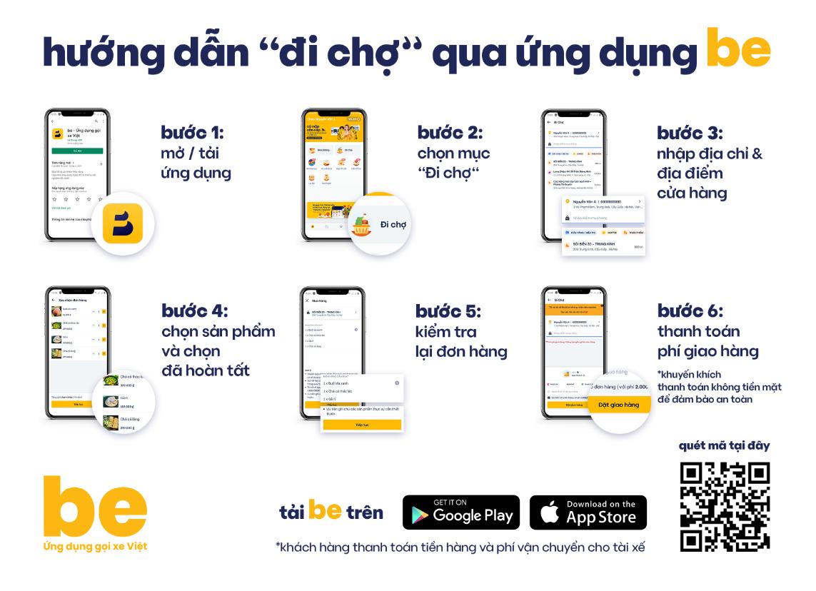Để sử dụng dịch vụ “đi chợ cho người dân”, người dùng cần tải ứng dụng Be về điện thoại thông minh và tạo tài khoản trên ứng dụng, sau đó vào danh mục “Đi chợ”, nhập địa điểm giao hàng và địa chỉ cửa hàng, lựa chọn các mặt hàng, số lượng hàng cần mua và bấm nút xác nhận đơn hàng. Hệ thống Be sẽ lựa chọn tài xế thuận tiện nhất để đi chợ hộ khách hàng và giao hàng tận nhà.