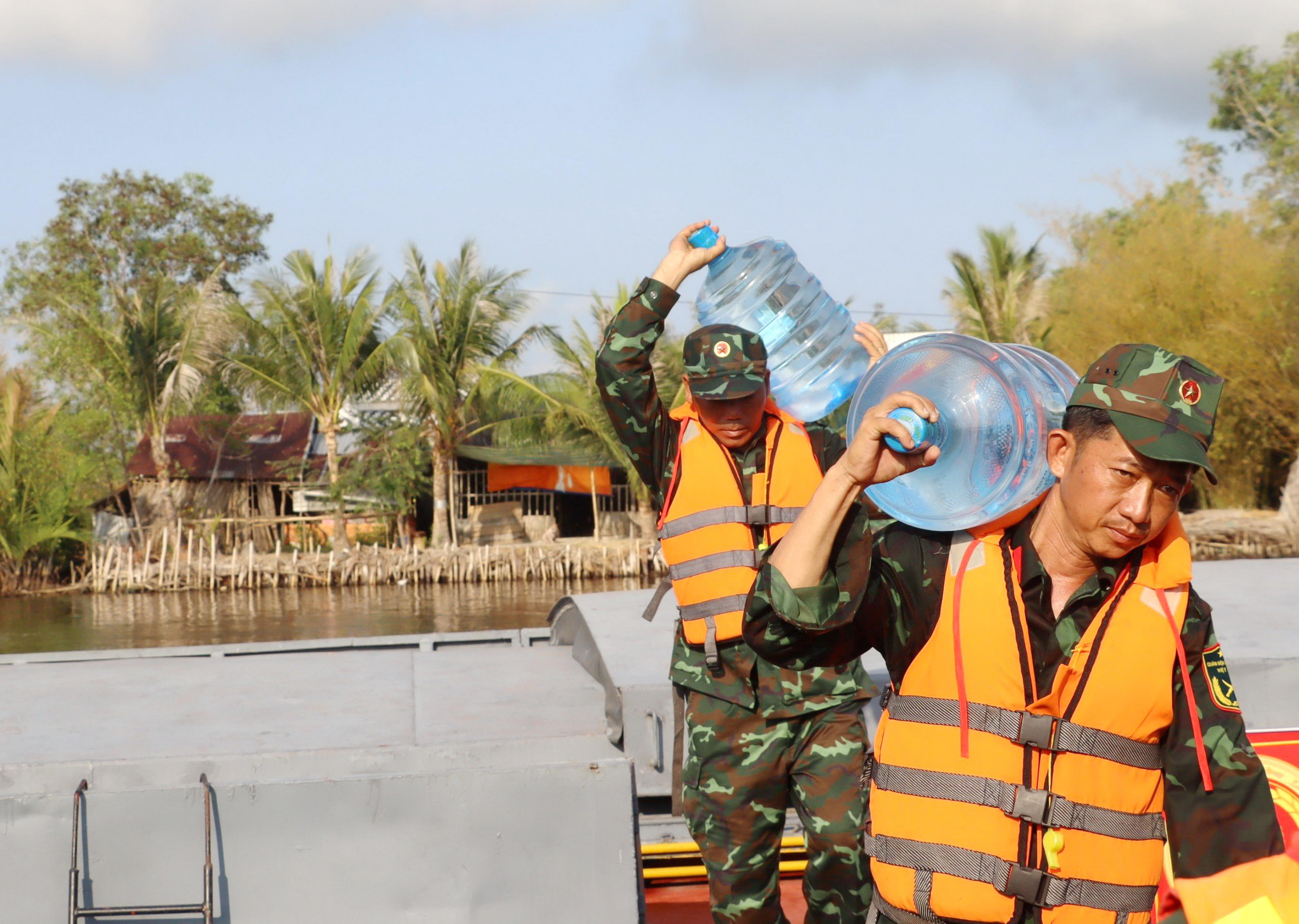 Lực lượng vũ trang QK9 vận chuyển bình nước sạch cho người dân. |