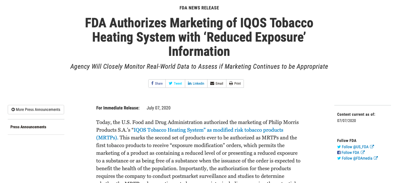 Cục Quản lý Thực phẩm và Dược phẩm Hoa Kỳ (FDA) cũng đã cho phép thuốc lá làm nóng (chỉ có một sản phẩm có đệ trình và được thẩm định từ FDA) được phép kinh doanh là Sản phẩm thuốc lá điều chỉnh nguy cơ – giảm thiểu phơi nhiễm (MRTP).