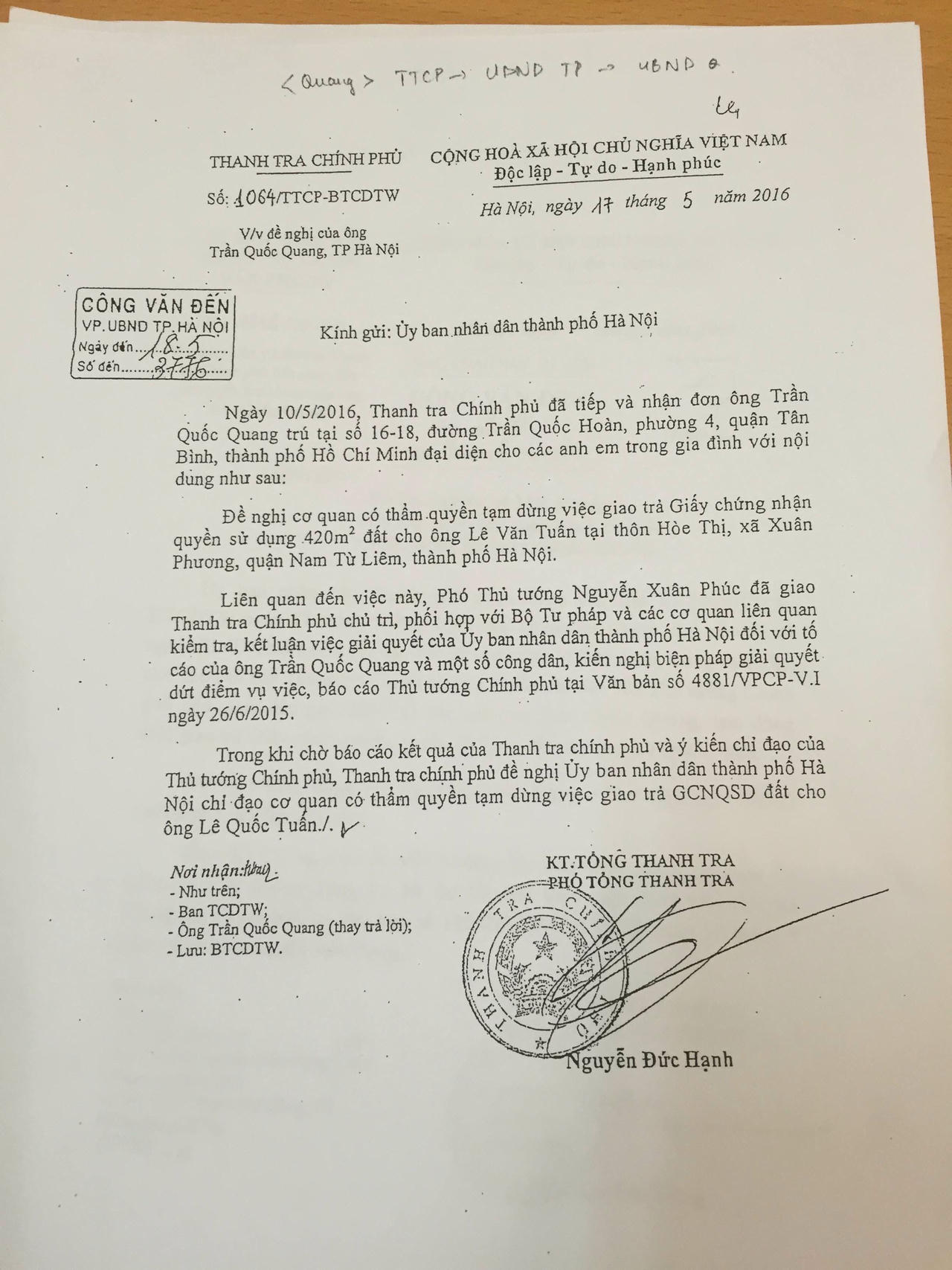 | Văn bản của Thanh tra chính phủ chỉ đạo xuống UBND Thành phố về viêc tạm dừng việc cấp sổ đỏ cho ông Lê Văn Tuấn |
