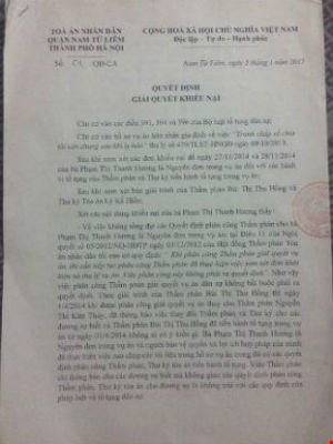 Được biết, tại buổi làm việc với bà Hương ngày 17/12/2014 để giải quyết khiếu nại - tố cáo, Phó Chánh án TAND quận Nam Từ Liêm Chu Thiện Nghĩa đã xác nhận: “...Chúng tôi thừa nhận là sai, tôi phải chờ báo cáo của thẩm phán để tôi tiếp tục nghiên cứu”. Ông Nghĩa hẹn một tuần sau sẽ có văn bản trả lời, nhưng gần 4 tháng sau (ngày 13/4/2015) bà Hương vẫn không nhận được công văn nào.