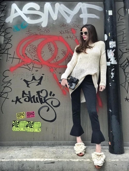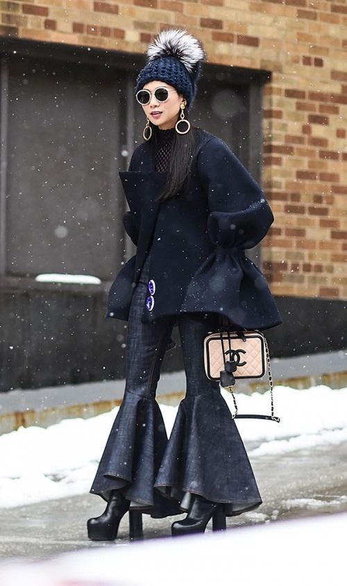 Từ năm ngoái, Hà Hồ nằm trong số ngôi sao thích diện phong cách này. Quần ống chuông màu đen cơ bản kết hợp với áo len dáng dài được Hà Hồ phá cách cài một bên đã tạo nên cho cô nàng một style cực chất.