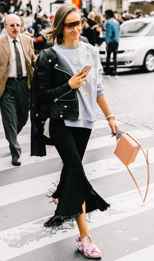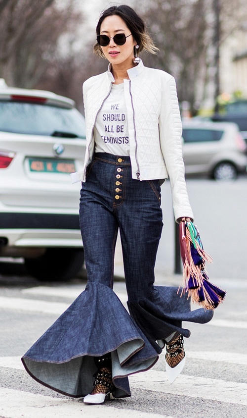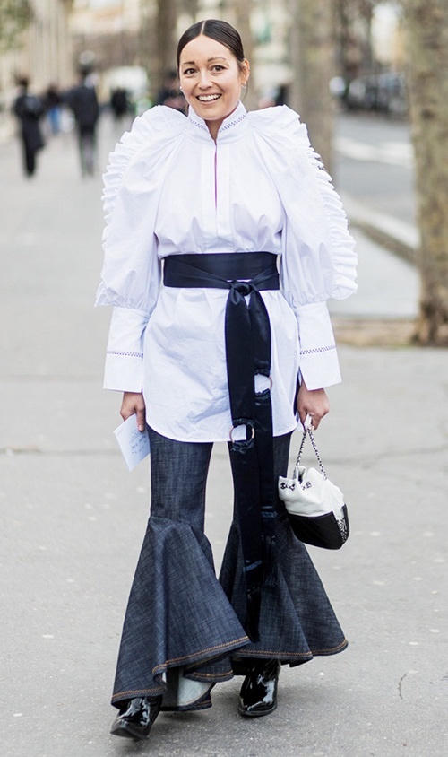 Một tín đồ kết hợp mốt ống chuông từ áo đến quần trên đường phố đầu năm.
