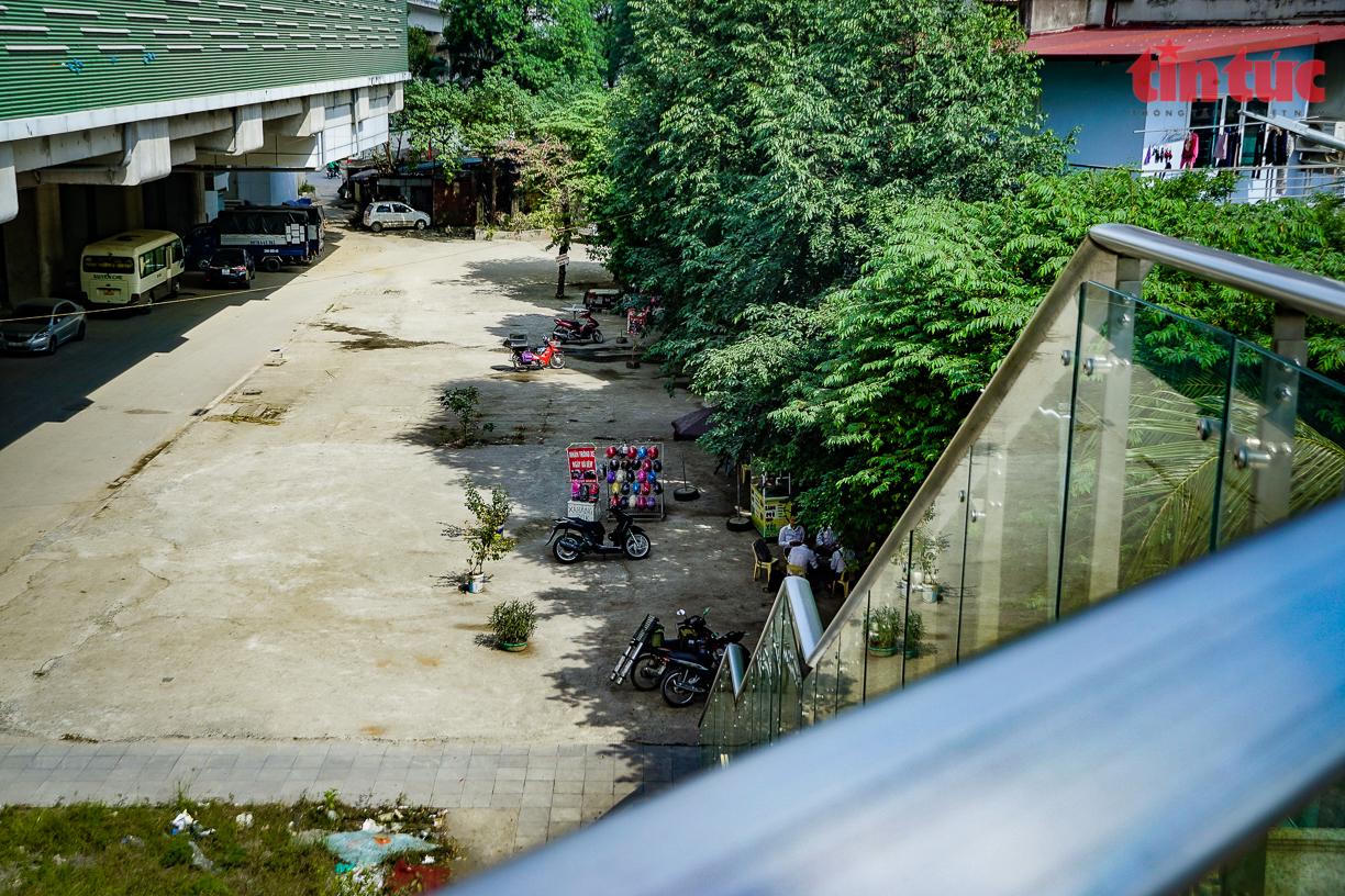Nhìn từ cầu thang dành cho người đi bộ có thể thấy quán trà đá, hàng rong, thậm chí là nơi dừng đỗ ô tô cũng được người dân tận dụng triệt để.