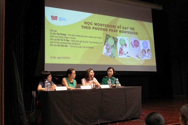 Buổi tọa đàm “Học Montessori để dạy trẻ theo phương pháp Montessori” do công ty sách Đinh Tị phối hợp cùng Trung tâm văn hóa Pháp tổ chức với sự tham gia của ba vị khách mời: cô giáo Hà Phương - phó hiệu trưởng chịu trách nhiệm chuyên môn của trường mầm non Flying Fingers School; Dịch giả Đỗ Thị Tố Nga và nhà báo Hà Việt Anh - thư ký tòa soạn Tạp chí Mẹ&Bé..