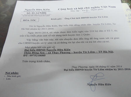 Ngày 6/1/2014, người dân tổ 7, thị trấn Cầu Diễn đã làm đơn nhờ đến sự giúp đỡ của ông Nguyễn Hữu Kiên (Đại biểu HĐND huyện Từ Liêm, người duy nhất không "ấn nút" tán thành tách huyện Từ Liêm thành 2 quận), kèm theo đó là chữ ký của 210 người thuộc 210 hộ dân tổ 7, thị trấn Cầu Diễn. Trong đơn trình bày về việc cuộc sống bị đảo lộn sau khi di chuyển họ về phường Phúc Diễn, thuộc quận Bắc Từ Liêm.