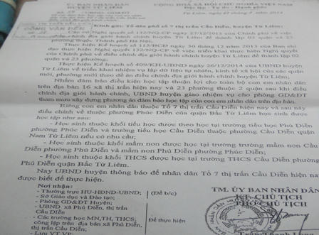 Ngày 17/1/2014, UBND huyện Từ Liêm cũng gửi đến tổ 7 thị trấn Cầu Diễn văn bản phúc đáp. Trong văn bản UBND huyện cũng hứa sẽ tạo điều kiện học tập thuận lợi cho con em tổ 7. Cụ thể: Học sinh khối tiểu học được theo học tại phường Phúc Diễn và phường Cầu Diễn nếu có nhu cầu. Học sinh mầm non cũng được theo học tại phường Phú Diễn và phường Phúc Diễn nếu có nhu cầu. Học sinh THCS được học tại phường Phú Diễn, quận Bắc Từ Liêm.