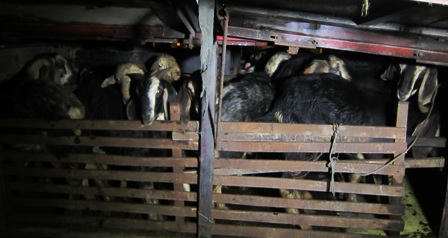 Dưới gầm phía sau xe này được ngăn thành chuồng bằng nhiều thanh gỗ và nhốt vào 12 con cừu, 13 con dê đều còn sống.