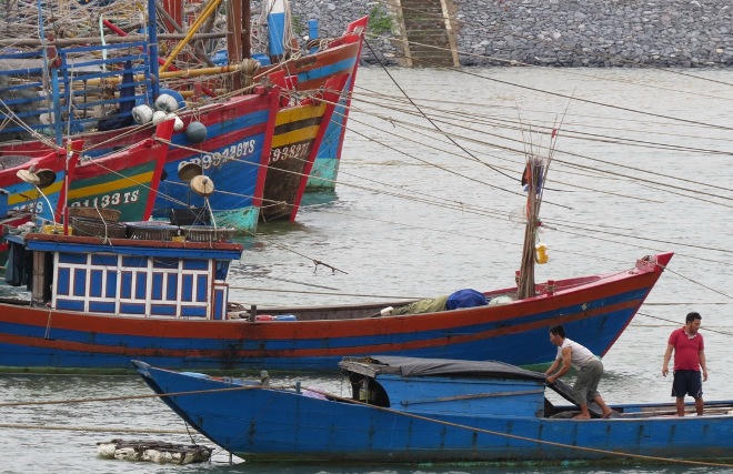 | Ngư dân Quảng Bình đưa tàu thuyền vào neo đậu và chằng néo, gia cố tại Khu neo đậu Cửa Phú, xã Bản Ninh, TP. Đồng Hới. |
