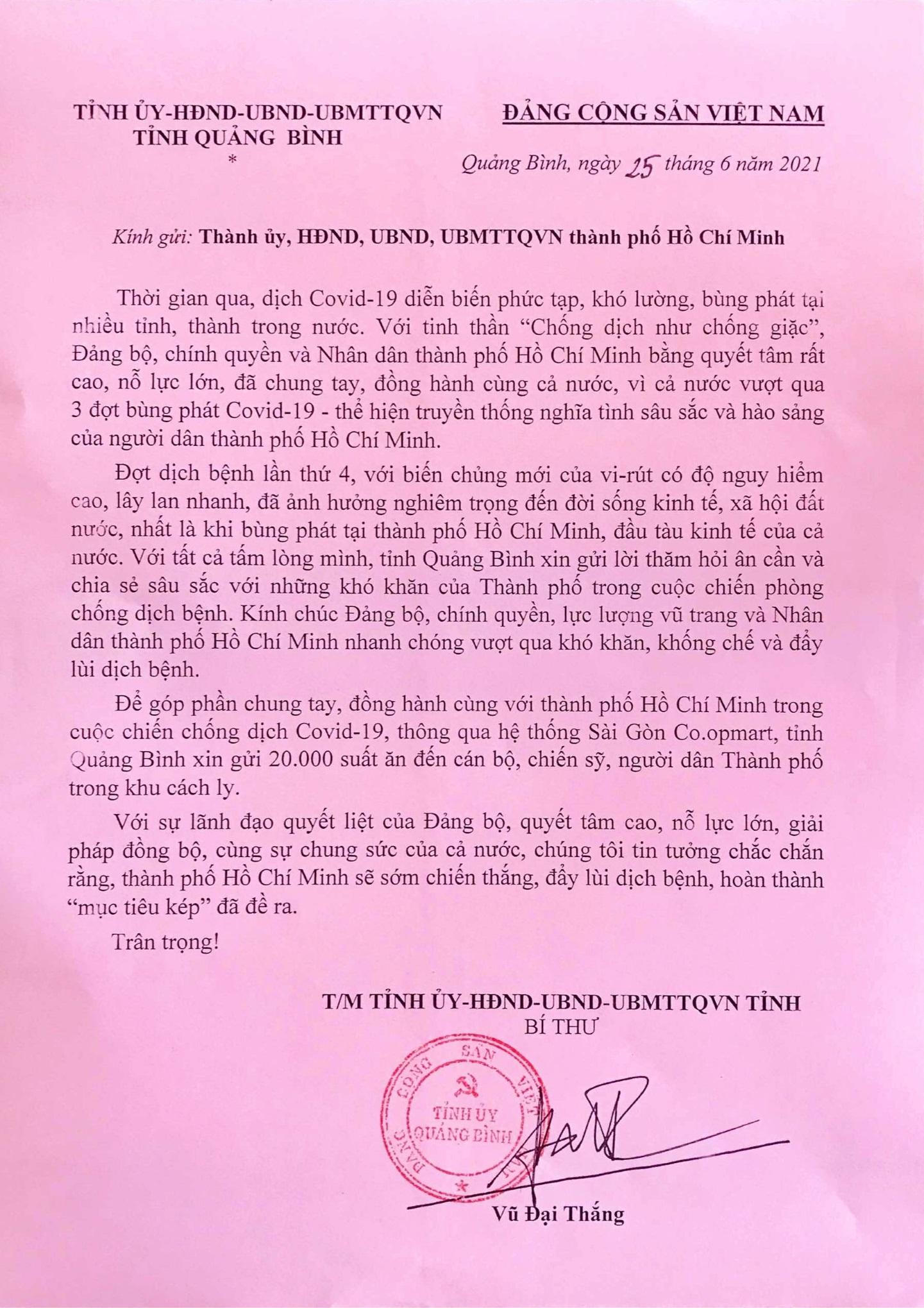 Trước những diễn biến phức tạp của dịch bệnh COVID-19 tại TP HCM, ngày 25/6, Tỉnh ủy, HĐND, UBND, UBMTTQVN tỉnh Quảng Bình đã gửi thư thăm hỏi và tặng quà Đảng bộ, chính quyền và nhân dân TP HCM để chung tay cùng chống dịch COVID-19.