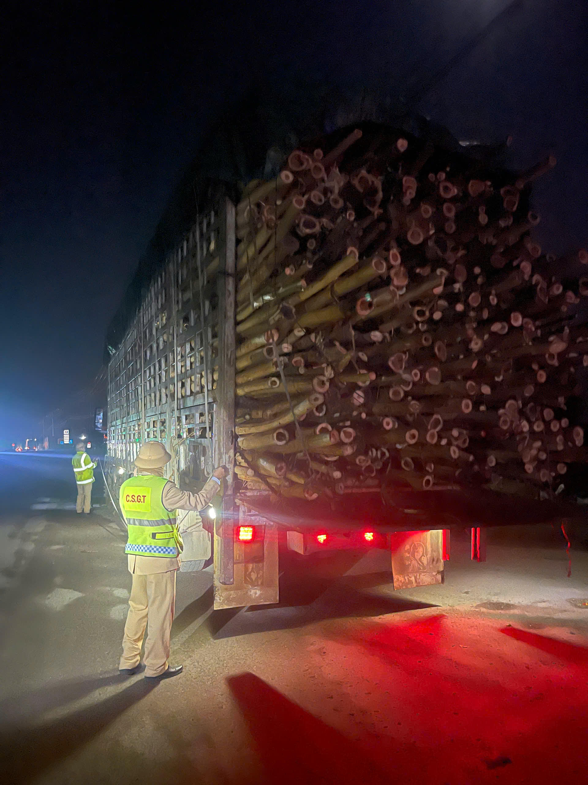 Lực lượng CSGT Công an Quảng Bình tăng cường tuần tra xử lý xe quá tải vào ban đêm. |