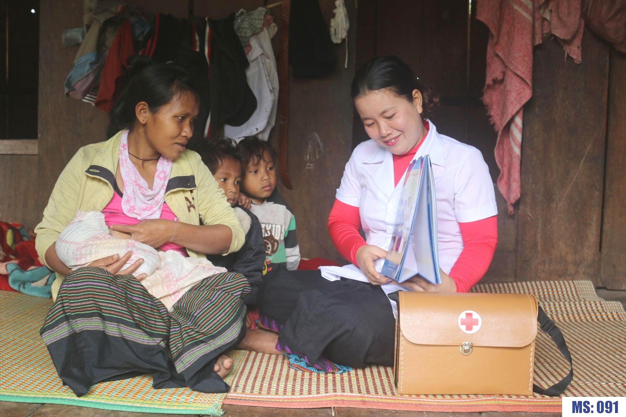 Một bà mẹ người dân tộc thiểu số ở Quảng Bình được cán bộ y tế cơ sở đến tận nhà tư vấn kiến thức chăm sóc trẻ sơ sinh. |
