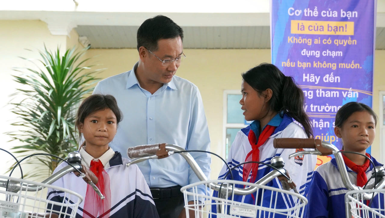 Bí thư Tỉnh ủy Quảng Bình Lê Ngọc Quang tặng xe đạp cho những học sinh vượt khó. |