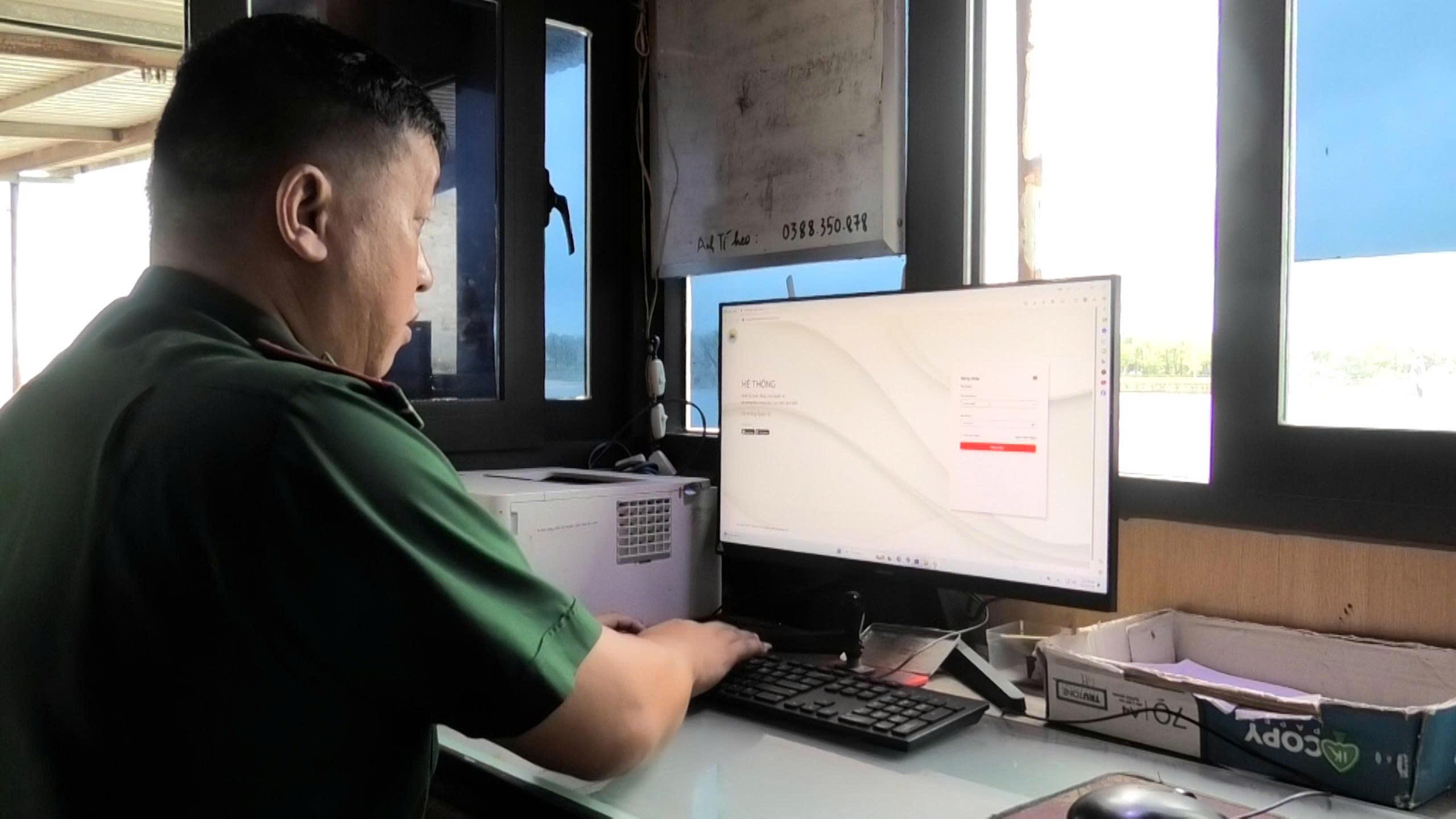 Cán bộ Đồn Biên phòng Nhật Lệ kiểm tra hệ thống giám sát tàu cá. |