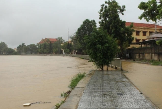 | Nhiều địa bàn ở tỉnh Quảng Bình hiện vẫn đang ngập trong lũ. Trong ảnh là 1 con đường ở thị trấn Kiến Giang, huyện Lệ Thủy vào chiều 17/10. Ảnh: Thành Long. |