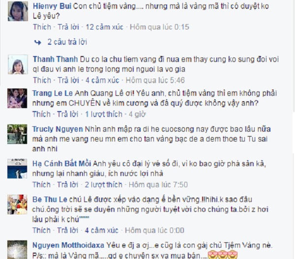 Cũng có rất nhiều khán giả hùa vào cùng chia sẻ dí dỏm của anh để thêm vào những lời bình luận đầy hóm hỉnh bên dưới. Facebook Hienvy Bui bình luận "Con chủ tiệm vàng... nhưng vàng mã thì có duyệt không Lê yêu" rất hài hước.