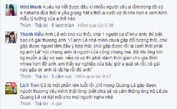 Sau vài giờ đăng tải, đoạn trạng thái của Quang Lê đã nhanh chóng thu hút sự quan tâm từ phía cộng đồng mạng. Trong khi nhiều người cho rằng, có lẽ nam ca sĩ “Đập vỡ cây đàn” đang trêu đùa . Hiện anh vẫn chưa lên tiếng phản hồi về vấn đề này.