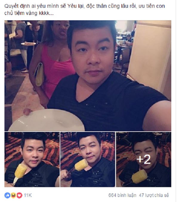 Mới đây nhất, trên trang cá nhân của mình, Quang Lê bất ngờ đăng tải những hình ảnh anh đang selfie khá tự nhiên kèm dòng chú thích nhằm ám chỉ đến chuyện tình cảm lứa đôi. Theo đó, nam ca sĩ dí dỏm cho biết, “Quyết định ai yêu, mình sẽ yêu lại, độc thân cũng lâu rồi, ưu tiên con chủ tiệm vàng”