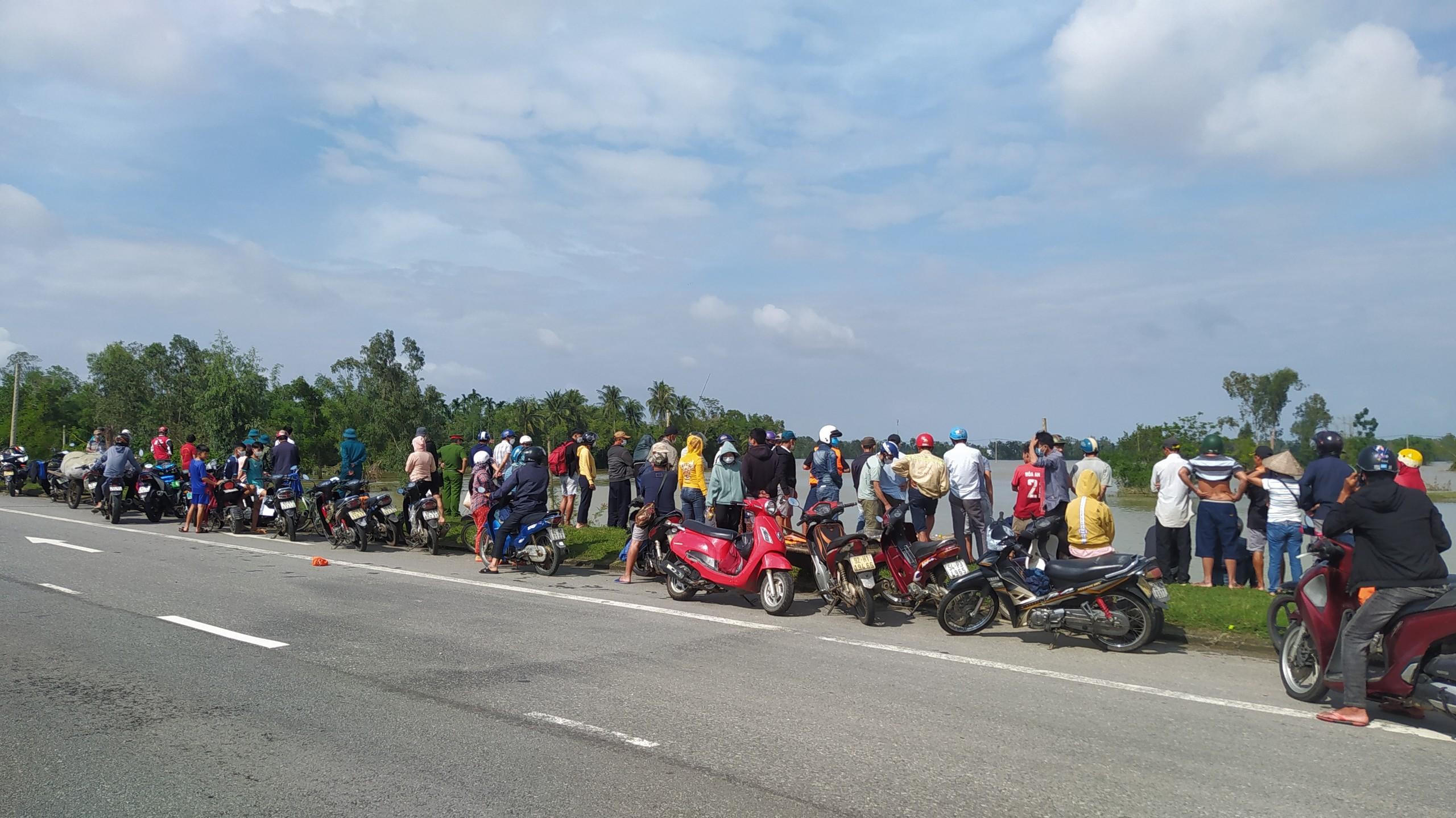 Rất đông người dân hiếu kỳ tập trung theo dõi tìm kiếm thi thể nạn nhân mất tích do bị lũ cuốn. |
