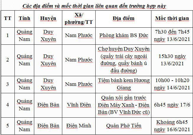 Liên quan đến ca nghi nhiễm mới này, ngành Y tế tỉnh Quảng Nam thông báo những ai từng đến các địa điểm và mốc thời gian sau nhanh chóng khai báo với cơ sở y tế gần nhất.