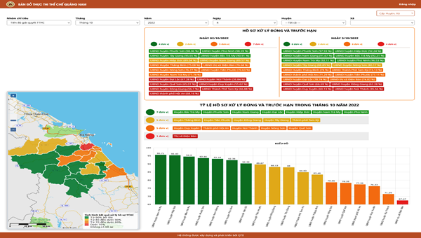 Theo ông Thái Hồng Nhất, Chủ tịch UBND phường An Mỹ (TP Tam Kỳ) chia sẻ, chỉ cần truy cập vào bản đồ thực thi thể chế, sẽ biết tiến độ giải quyết thủ tục hành chính của phường được triển khai đến đâu, tồn đọng mức nào. Thông qua đây, giúp lãnh đạo phường kịp thời tăng cường chỉ đạo các bộ phận chuyên môn thực hiện đảm bảo việc tiếp nhận và xử lý hồ sơ trên phần mềm một cửa điện tử; thực hiện trả hồ sơ đúng hẹn. Nếu kiểm tra trên phần mềm thấy có hồ sơ gần đến ngày trả thì đôn đốc bộ phận chuyên môn giải quyết và trả hồ sơ cho đúng với thời gian quy định.