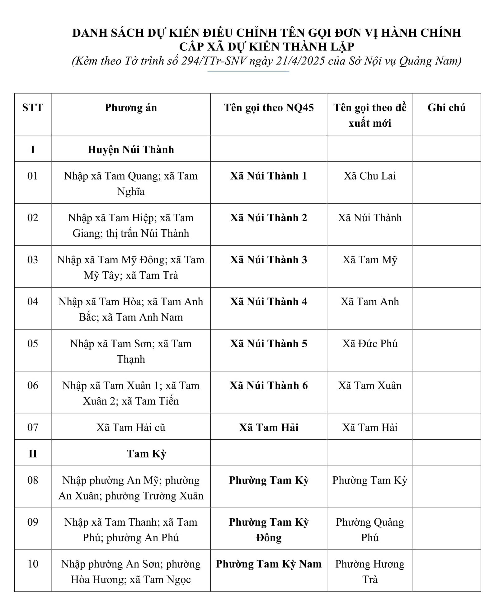 Ngày 21/4, Hội nghị Tỉnh ủy Quảng Nam đã thảo luận, thống nhất thay đổi phương án đặt tên 88 xã, phường mới hình thành sau quá trình sắp xếp, sáp nhập. Thay vì đặt tên theo thứ tự hành chính, tỉnh lắng nghe ý kiến nhân dân, lựa chọn các tên gọi gắn liền với giá trị văn hóa, lịch sử địa phương.
