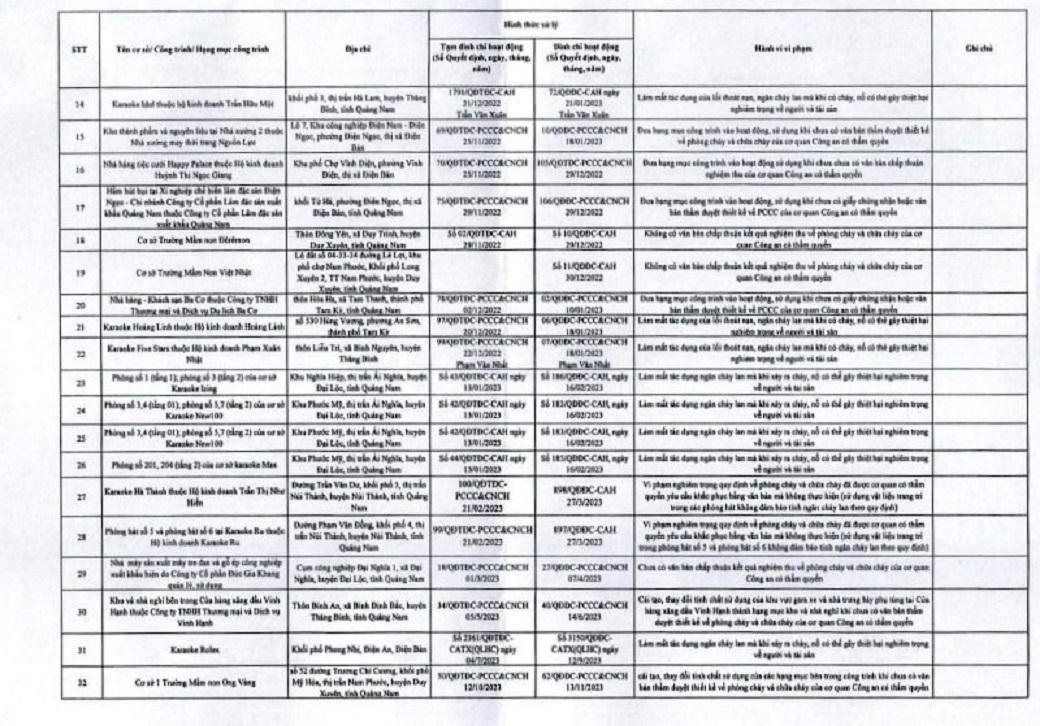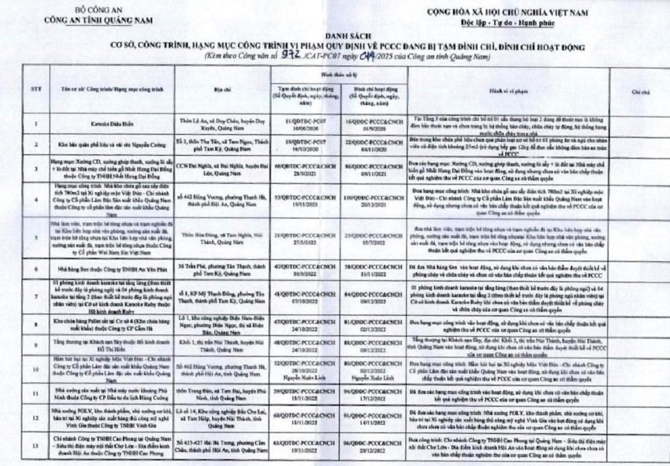 Danh sách các cơ sở bị tạm đình chỉ, đình chỉ do vi phạm quy định PCCC ở Quảng Nam quý I/2025. |