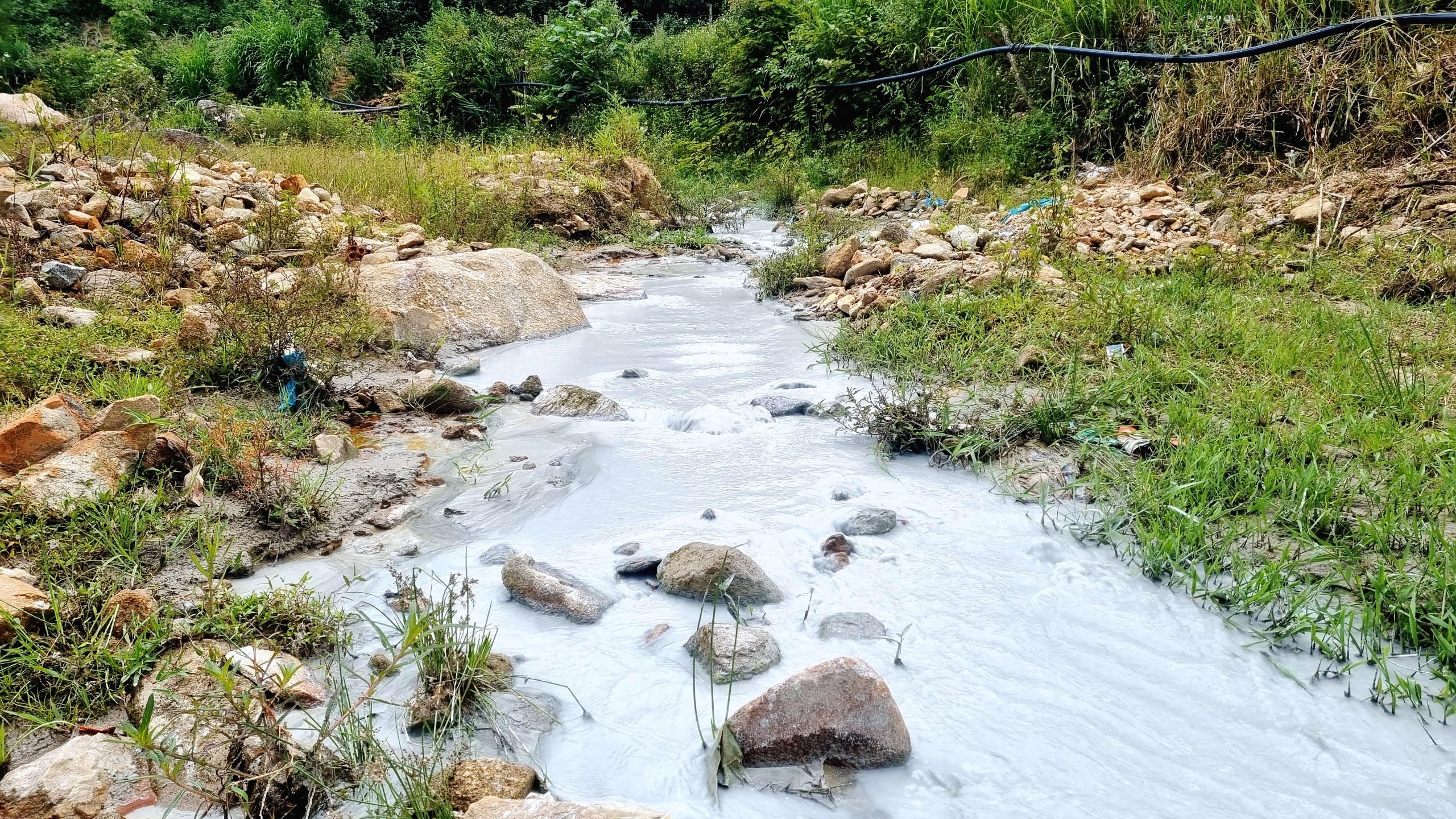 Con suối bị nhuộm trắng đục như sữa do nước thải từ hoạt động khai thác mỏ vàng Bãi Ruộng. |