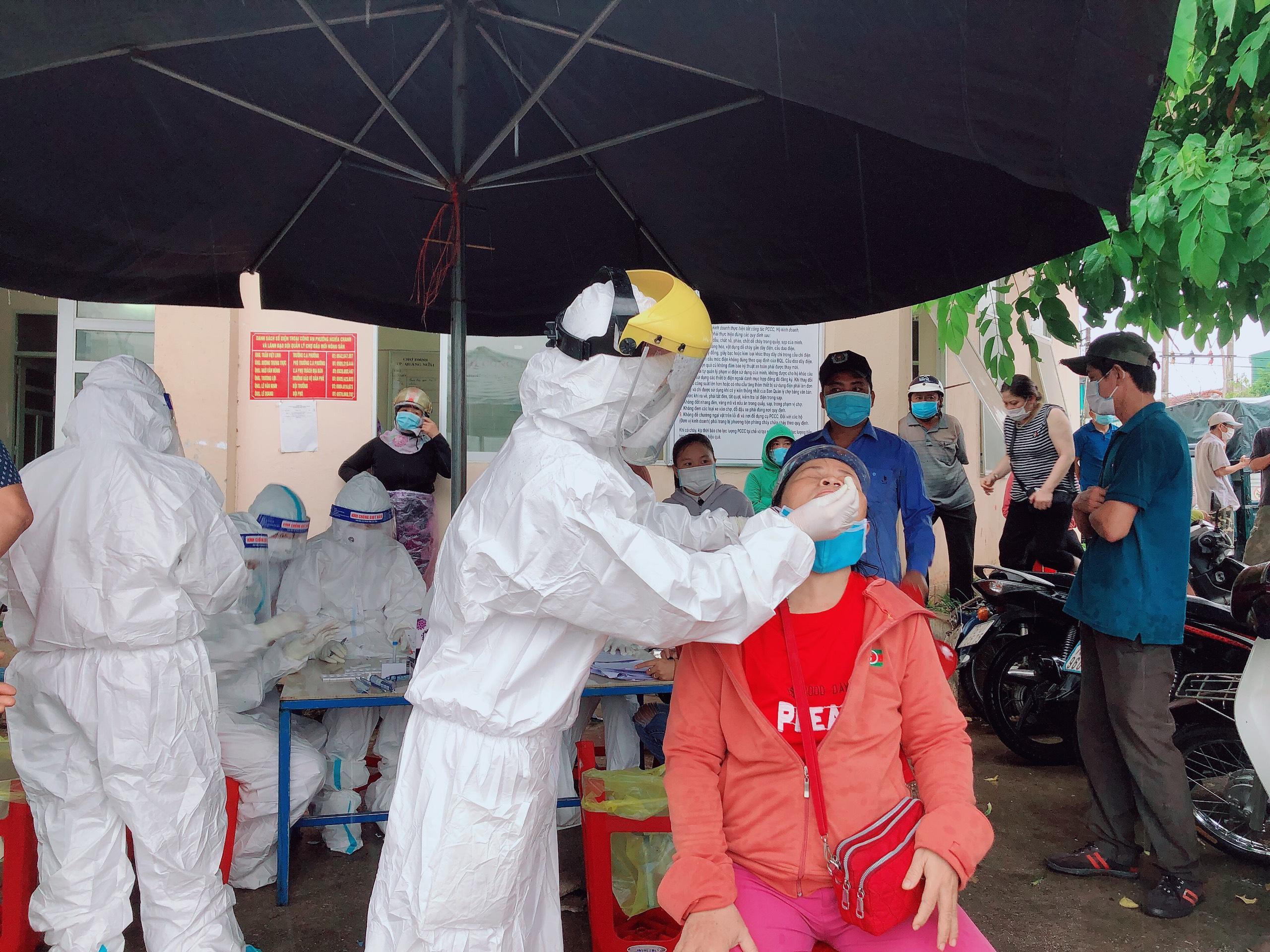 Cũng trong sáng nay, Ban chỉ đạo Phòng, chống dịch COVID-19 tỉnh Quảng Ngãi cũng đã tiến hành phong tỏa và test nhanh 500 tiểu thương và khoảng 300 người mua hàng tại chợ Đầu mối Nông sản TP Quảng Ngãi.