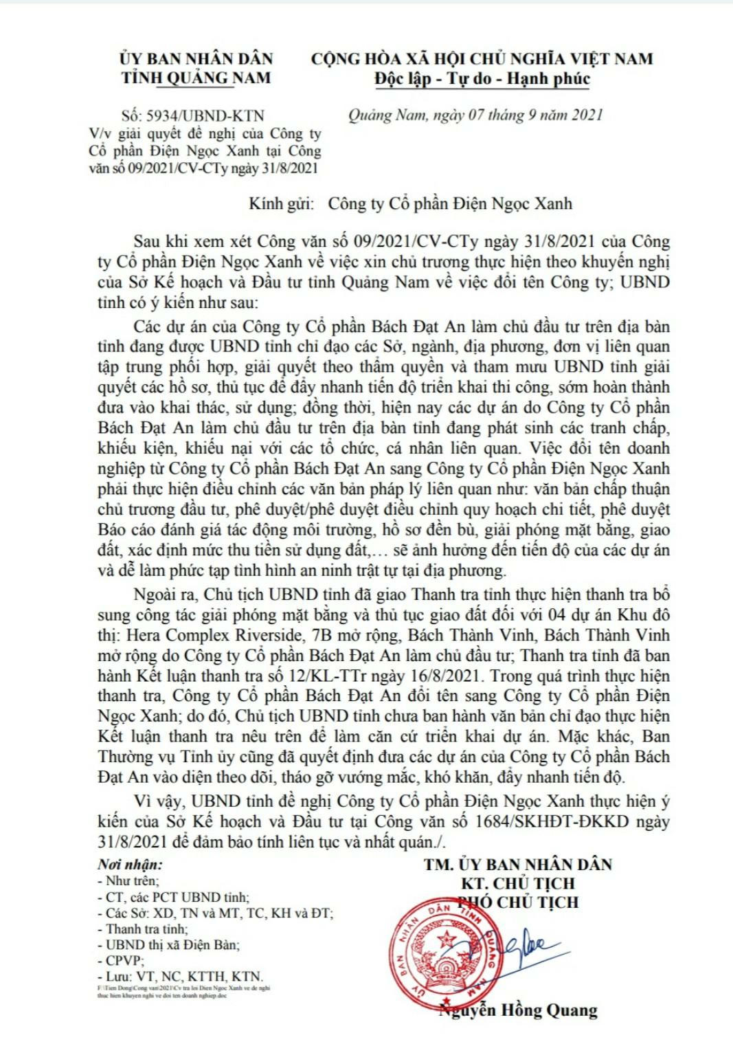 Văn bản trả lời của UBND tỉnh Quảng Nam về việc Công ty CP Bách Đạt An đổi tên thành Công ty CP Điện Ngọc Xanh |