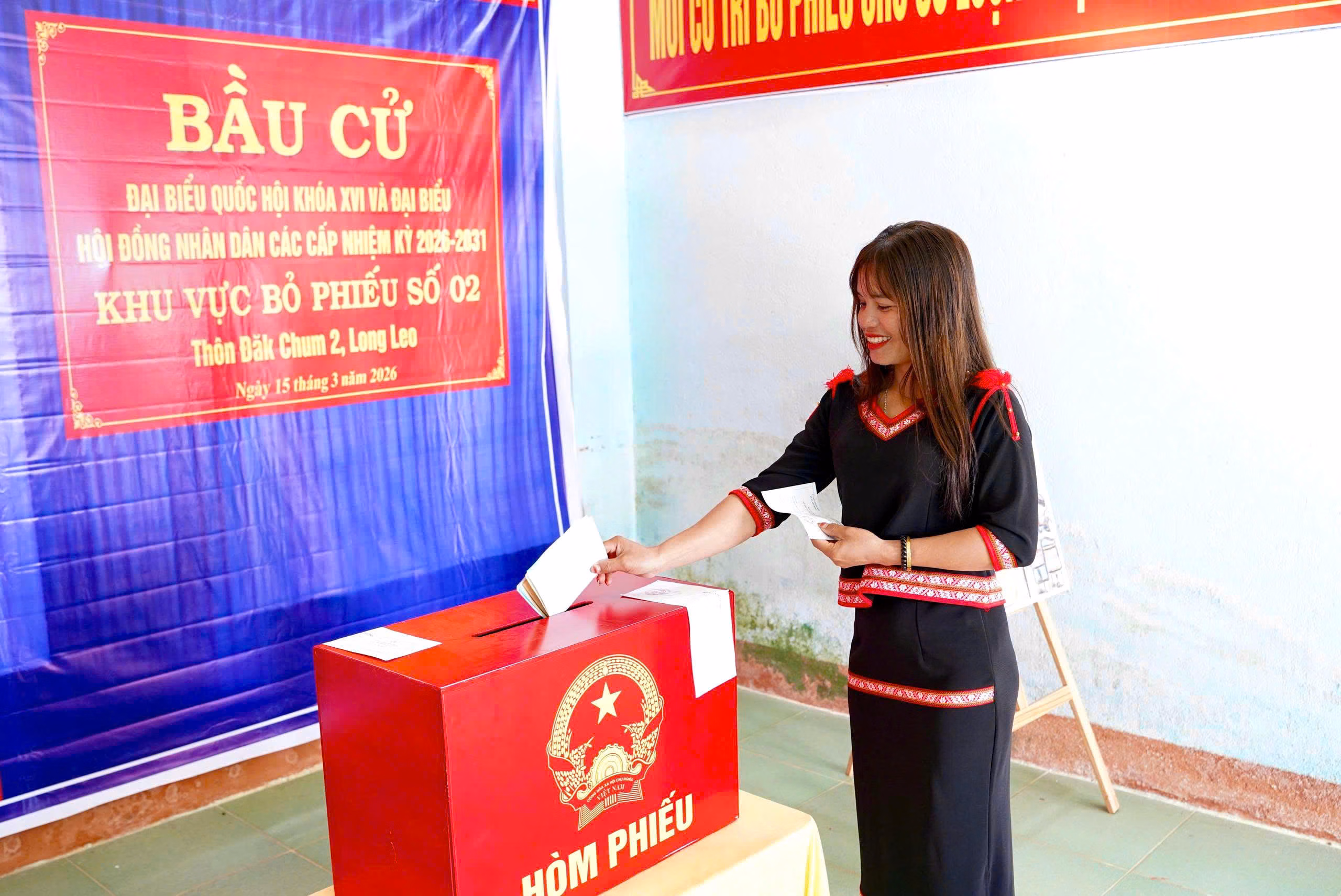 Sau khi được hướng dẫn, từng cử tri lần lượt thực hiện việc bỏ phiếu trong trật tự, đúng quy định. Dòng người kiên nhẫn xếp hàng chờ đến lượt, tạo nên không khí khẩn trương nhưng ấm áp như ngày hội lớn của buôn làng. Nhiều người còn dừng lại ngắm những bức tranh cổ động do học sinh vẽ, ánh mắt ánh lên niềm tự hào và kỳ vọng.