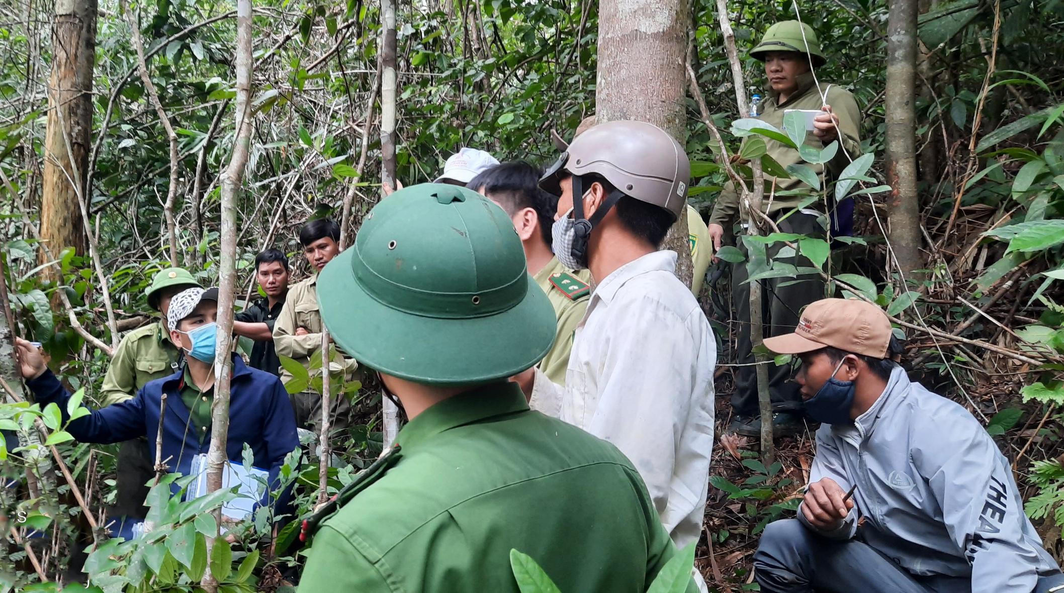 Lực lượng chức năng khám nghiệm hiện trường vụ săn bắt, giết hại 5 cá thể voọc chà vá chân xám và 01 con sóc bay tại xã Ba Trang, huyện Ba Tơ. |
