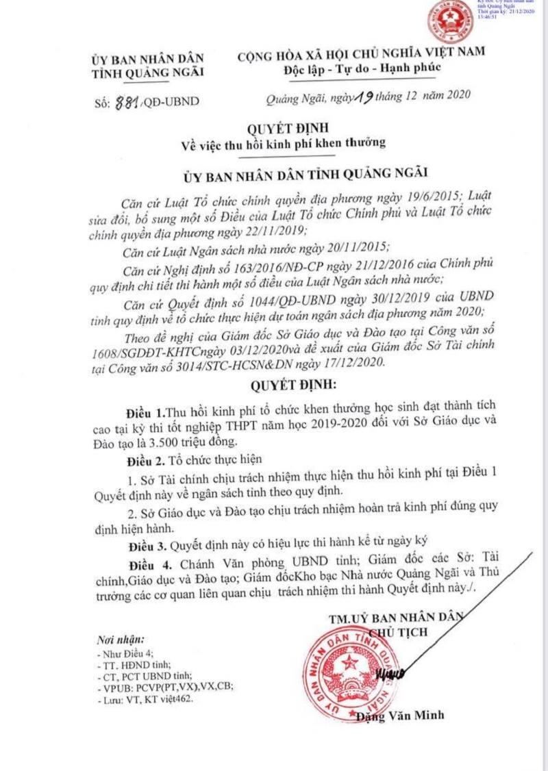 Chủ tịch UBND tỉnh Quảng Ngãi Đặng Văn Minh cũng xác nhận, Sở GD&ĐT trình dự toán khen thưởng cho học sinh đạt điểm cao trong kỳ thi tốt nghiệp THPT năm 2020 nhưng khi đối chiếu với nghị quyết của HĐND tỉnh lại không đúng đối tượng được khen thưởng, nên UBND tỉnh quyết định thu hồi.