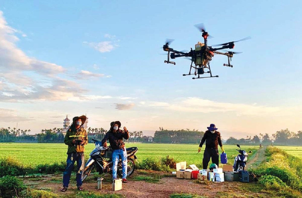 Phun thuốc bằng thiết bị bay không người lái tại một cánh đồng ở xã Đức Thắng (huyện Mộ Đức, Quảng Ngãi). |
