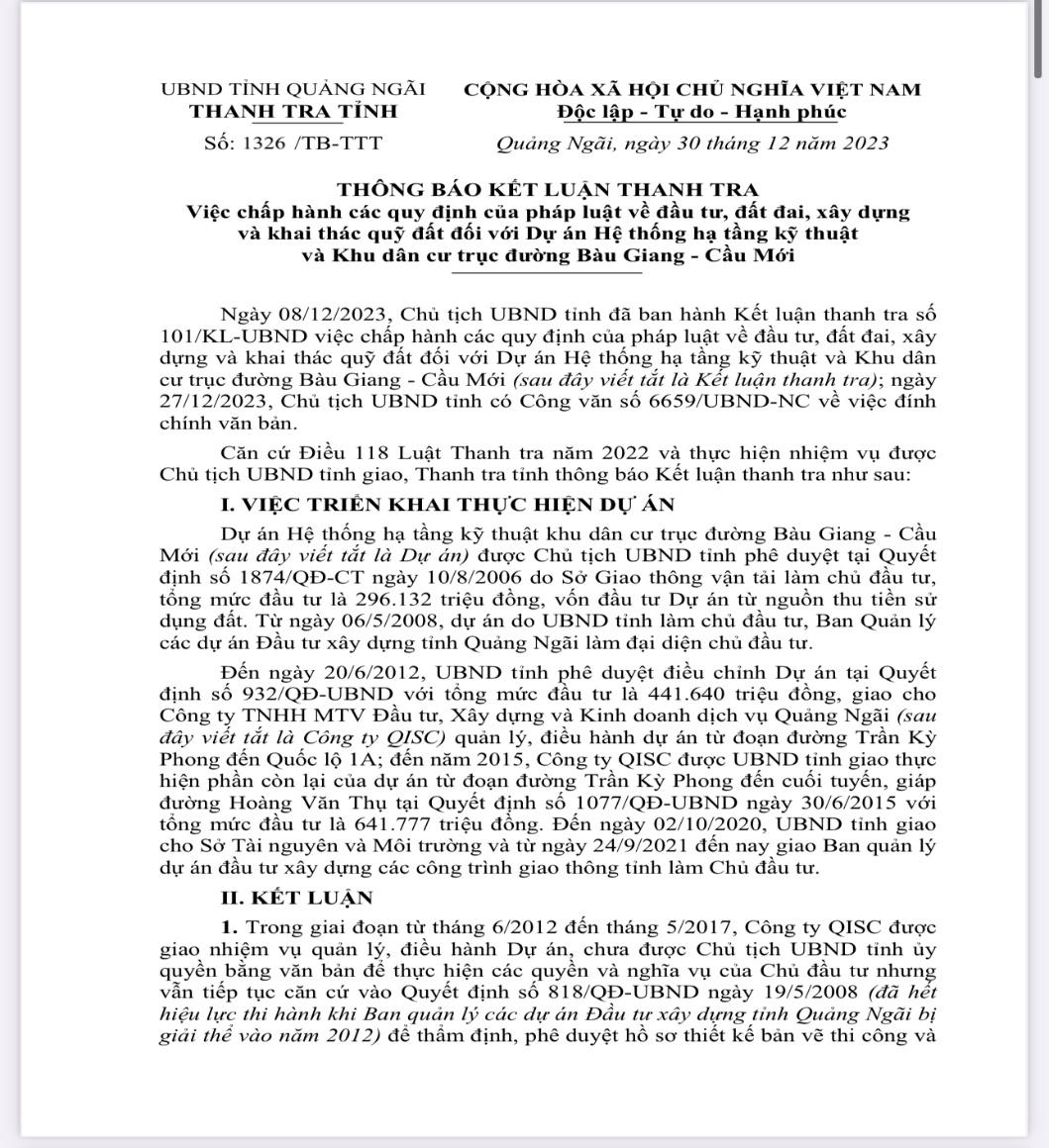 (PLVN) - Thanh tra tỉnh Quảng Ngãi vừa ban hành Kết luận thanh tra 1326/KL-TTT (KLTT) về việc chấp hành pháp luật về đầu tư, đất đai, xây dựng và khai thác quỹ đất với dự án Hệ thống hạ tầng kỹ thuật và khu dân cư trục đường Bàu Giang - Cầu Mới.