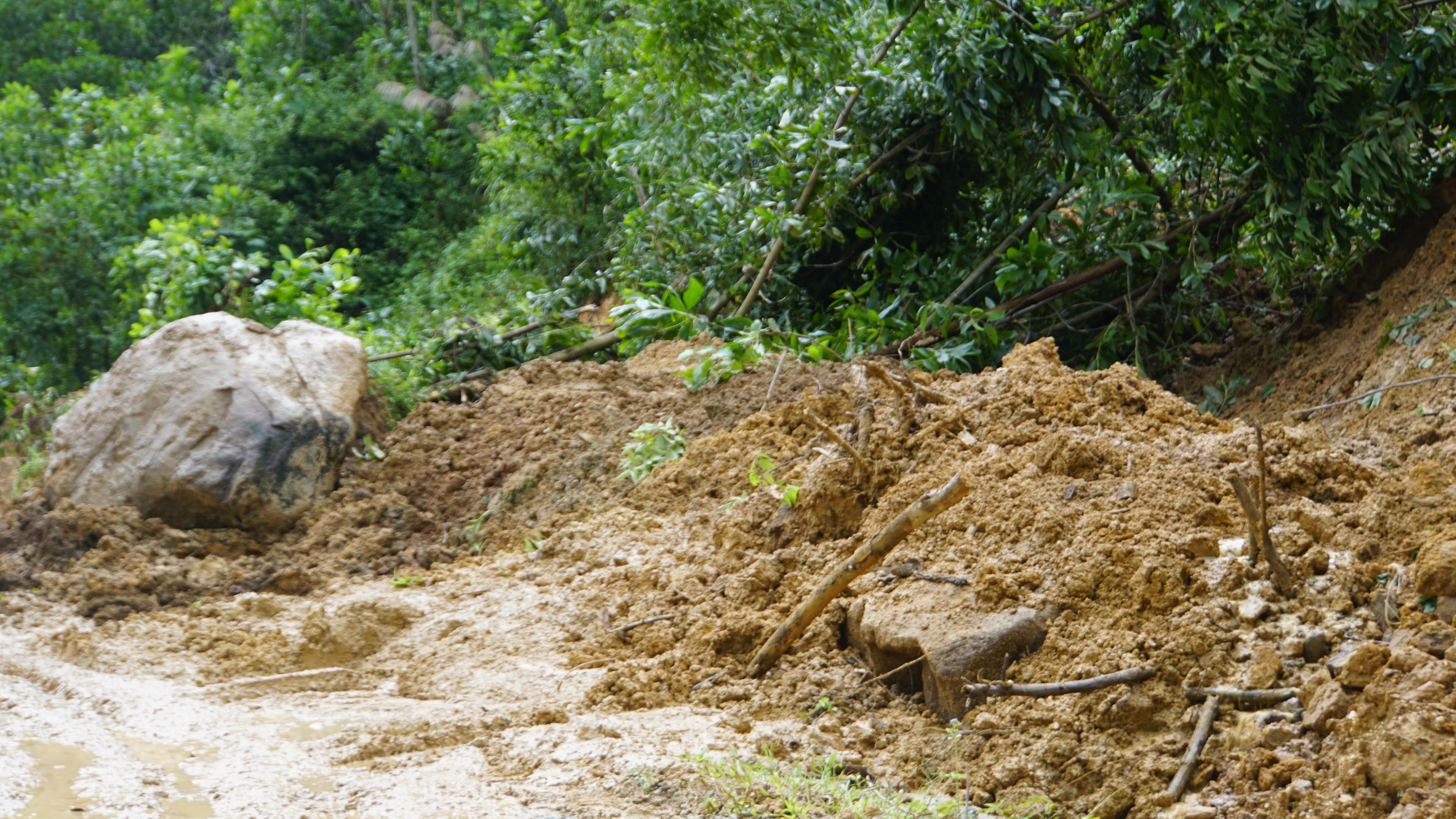 Núi sạt xuống đường, đất đá nằm ngổn ngang gây cản trở giao thông. |